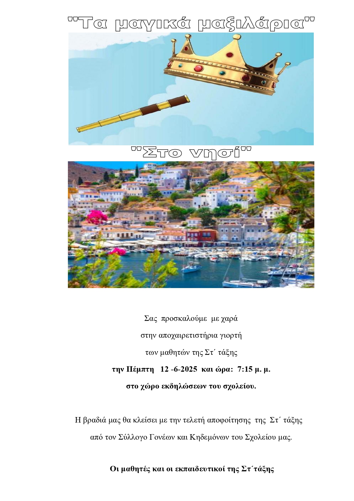 Η Διευθύντρια και ο Σύλλογος Διδασκόντων του Σχολείου μας συγχαίρουν τις μαθήτριες και τους μαθητές και τους εύχονται καλή πρόοδο και πάντα να πετυχαίνουν τους στόχους τους!!!