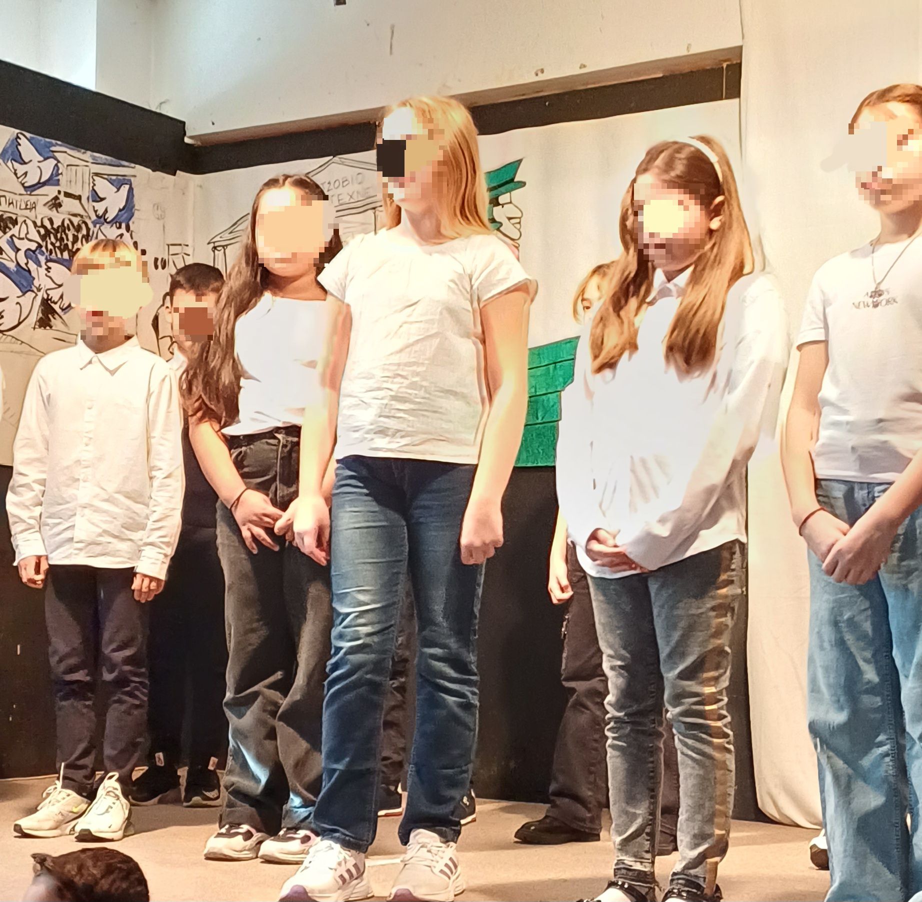 Η ιδιαίτερη αγάπη των μαθητών του σχολείου μας στις τέχνες εκφράστηκε εκτός από το θέατρο, τη δραματοποίηση και τη μουσική και μέσα από τη ζωγραφική με τα υπέροχα συλλογικά εικαστικά ποιήματα που εμπνεύστηκαν και δημιούργησαν με τη βοήθεια της δασκάλας των εικαστικών κ. Αθανασίας Κατσιλιέρη. Ξεχωρίσαμε την ομαδική δουλειά πάνω στο έργο του Έλληνα ζωγράφου Αλέξη Ακριθάκη με αναφορές και στις μορφές Keith Haring που στόλιζε την είσοδο στο χώρο της εκδήλωσης.