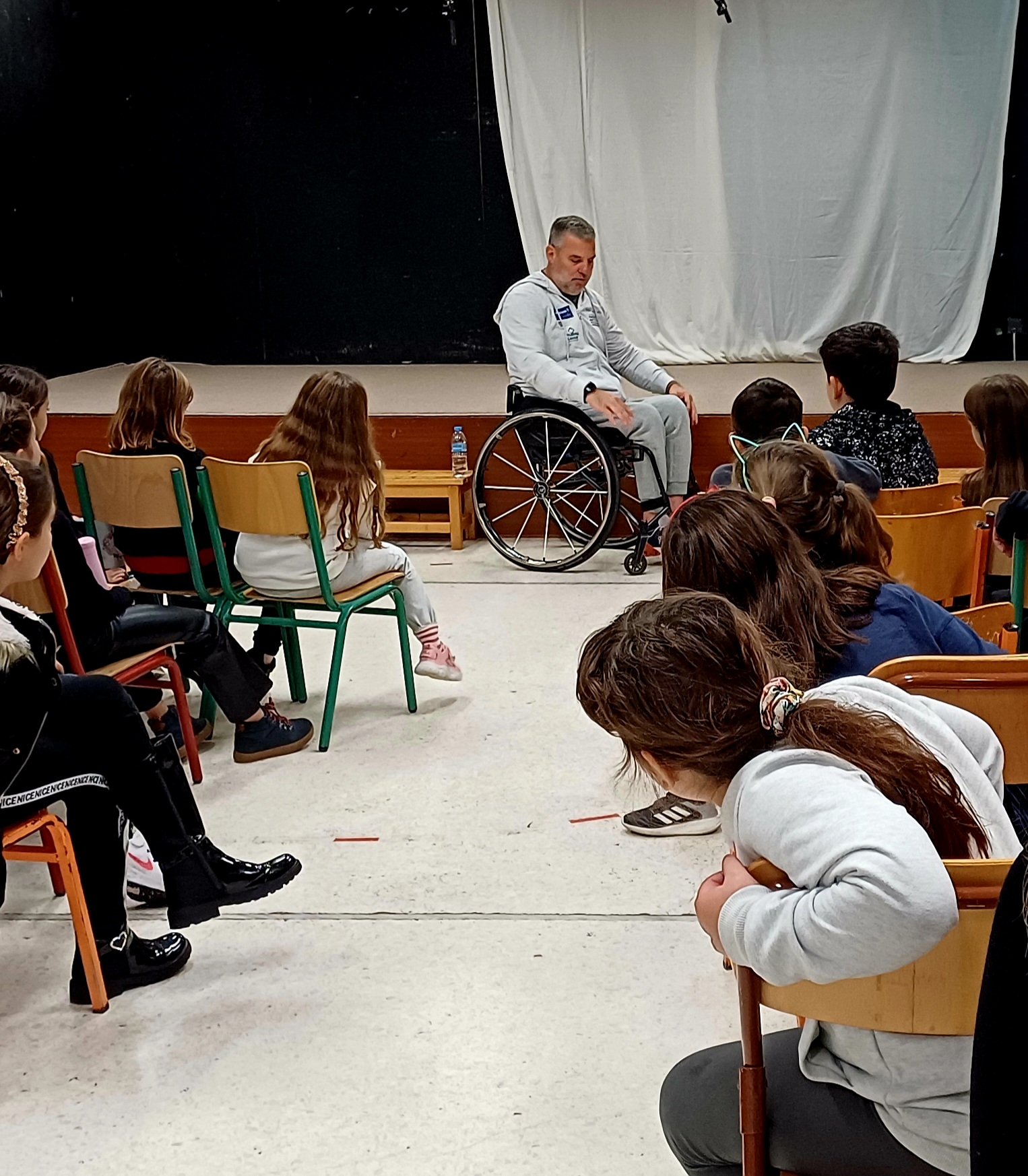 Τον κύκλο των δράσεων αυτών τη φετινή χρονιά άνοιξαν οι μαθητές της Γ΄ και Στ΄ τάξης την Τρίτη 28 Νοεμβρίου 2023 που προσκάλεσαν και υποδέχθηκαν με χαρά στο σχολείο μας τον συμπατριώτη μας παραολυμπιονίκη και πρωταθλητή στο τένις με αμαξίδιο κ. Γιώργο Λαζαρίδη, ένα ζωντανό παράδειγμα θάρρους και θέλησης που κατάφερε να νικήσει κάθε εμπόδιο αποκλεισμού αντιμετωπίζοντας με αισιοδοξία τη νέα του ζωή. Κορυφαίες στιγμές στη ζωή του η συμμετοχή του στην Παραολυμπιάδα του Πεκίνο το 2008 και στο Μαραθώνιο της Αθήνας το 2015. Οι μαθητές μας είχαν την ευκαιρία ν’ ακούσουν από τον ίδιο την ιστορία του, να κατανοήσουν τα συναισθήματά του μετά το ατύχημα που συνέβη στη ζωή του, καθώς και τις δυσκολίες που αντιμετώπισε και συνεχίζει να αντιμετωπίζει στην καθημερινότητά του και τους τρόπους που χρησιμοποιεί για να τις ξεπερνά. Ενημερώθηκαν για τα προβλήματα προσβασιμότητας των ατόμων που κινούνται με αμαξίδιο στη γειτονιά και στην πόλη τους και τον τρόπο που αυτοί διεκδικούν την ισότιμη συνύπαρξή τους στην κοινωνία. Συζητώντας μαζί του κατάλαβαν πως η ανθρώπινη ύπαρξη δεν έχει όρια αλλά δυνατότητες και ότι δεν πρέπει να σπαταλιέται σε αρνητικές σκέψεις ή να ξεγελιέται από περιορισμούς, αλλά να αξιοποιεί τις δυνατότητες, να αλλάζει πεποιθήσεις για να βελτιώνει την εμπειρία της. Επίσης συνειδητοποίησαν ότι κάθε εμπόδιο και δυσκολία δεν πρέπει να γίνεται τροχοπέδη στη ζωή, αλλά αφετηρία για αλλαγή του τρόπου της σκέψης και της ζωής. Αυτό ήταν και το πιο σπουδαίο μήνυμα που κράτησαν κατά τη συνάντησή τους με το σπουδαίο αυτό άνθρωπο και αθλητή.