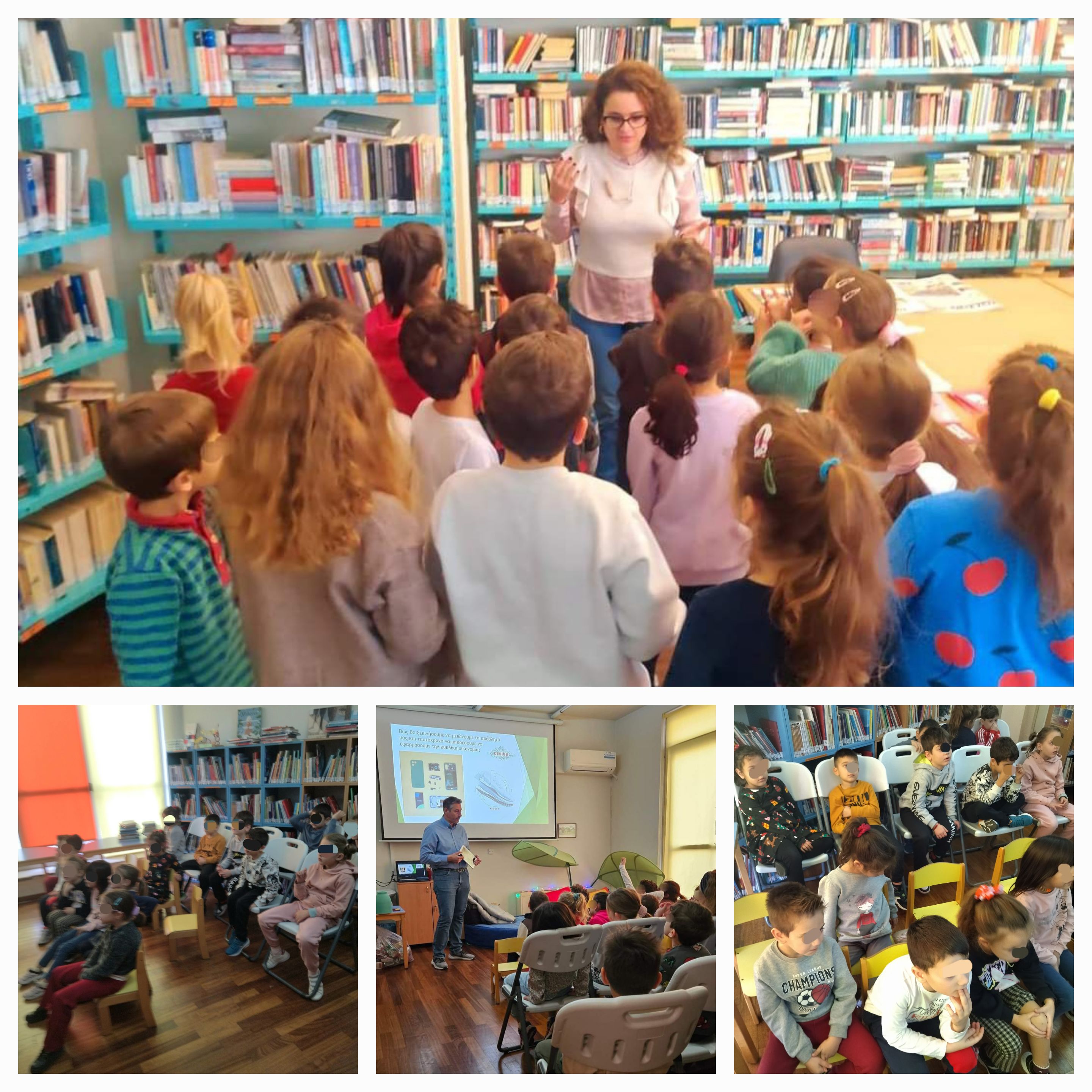Στη συνέχεια με τη συνοδεία των δασκάλων τους Βασιλικής Πλιάκα και Μαρίας Μαούνου επισκέφθηκαν τη Δημόσια Κεντρική Βιβλιοθήκη της πόλης μας, όπου είχαν τη ευκαιρία να γνωρίσουν από κοντά το χώρο της Βιβλιοθήκης, να μάθουν για την κατανομή και τοποθέτηση των βιβλίων στα ράφια και αρκετά ακόμη πράγματα για τη λειτουργία της. Παρακολούθησαν δε με πολύ ενδιαφέρον κι ένα σπουδαίο μάθημα κυκλικής οικονομίας για μικρούς μαθητές (!) από τον ειδικό κ. Αθανάσιο Μάκιο.
