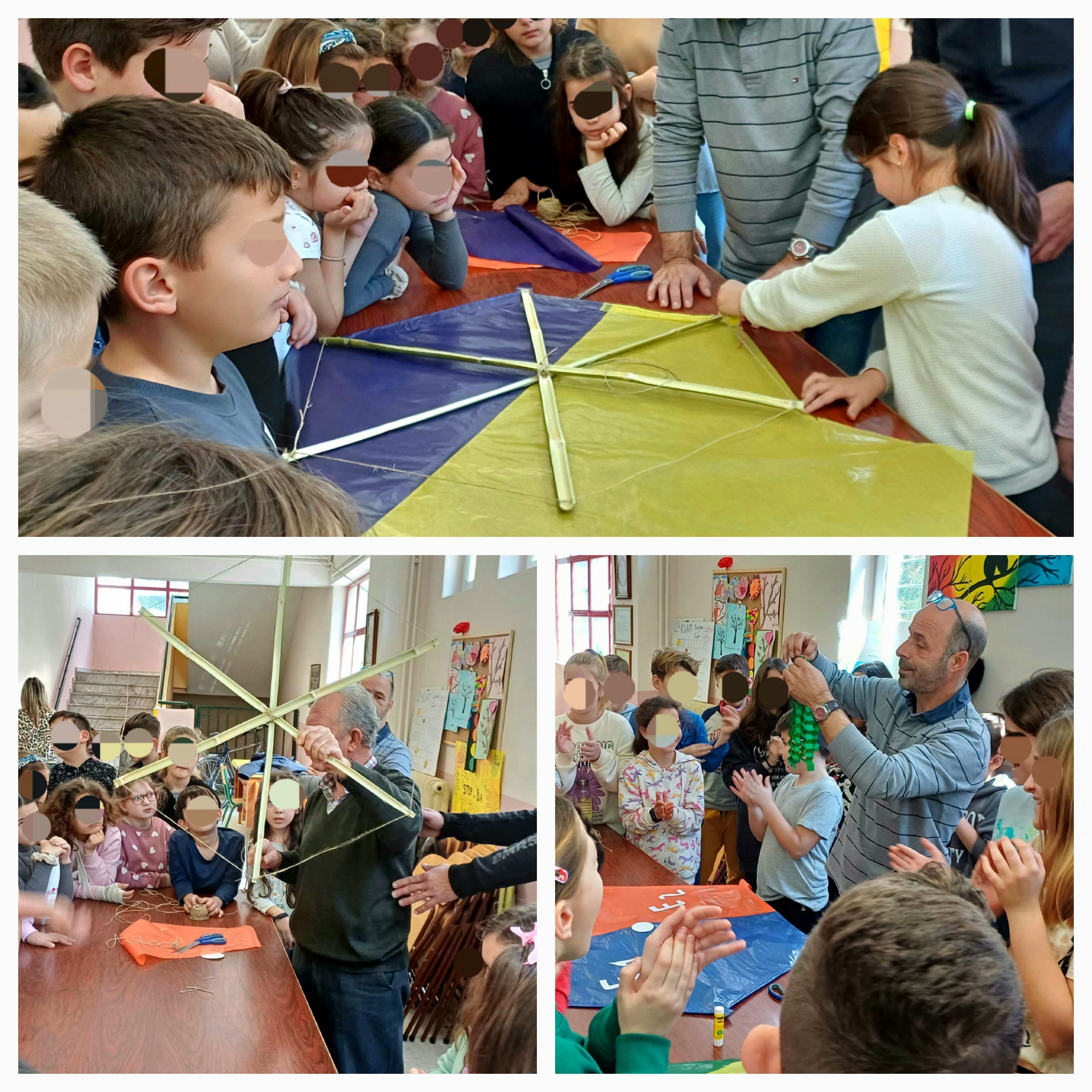 Στο πλαίσιο της αναβίωσης της τεχνικής του εθίμου, στο σχολείο μας την Παρασκευή 15 Μαρτίου 2024 δημιουργήθηκε, με πρωτοβουλία του Συλλόγου Γονέων και Κηδεμόνων και τη συνδρομή γονέων και παππούδων των μαθητών μας (τους οποίους και ευχαριστούμε θερμά), βιωματικό εργαστήριο κατασκευής χαρταετού. Αφού συγκέντρωσαν τα απαιτούμενα υλικά (καλάμια, σπάγκο, πολύχρωμα ριζόχαρτα, χαρτόνια, γλασσέ χαρτιά, κόλλες κ.ά.) με οδηγό τη φαντασία και τις οδηγίες των μεγάλων που κατείχαν τη γνώση, οι μαθητές όλων των τάξεων του σχολείου μας κατασκεύασαν πολύχρωμους χαρταετούς πραγματικών διαστάσεων, φιλοτεχνώντας τους με σχέδια και χρώματα της αρεσκείας τους.