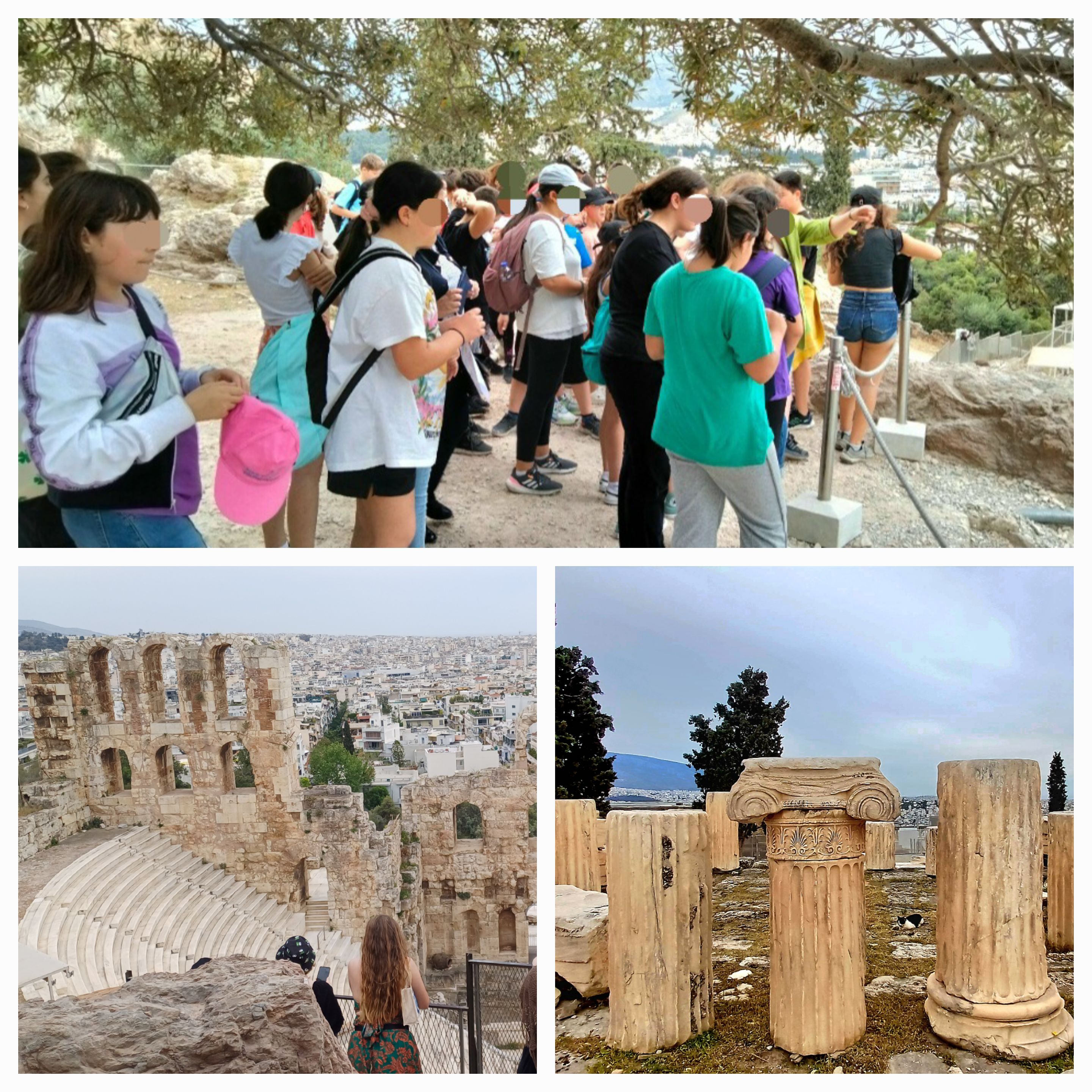 Η εκδρομή δε θα μπορούσε να κλείσει ωραιότερα παρά με μια βόλτα στον ξακουστό Ιερό βράχο της Ακρόπολης, τον πιο σημαντικό αρχαιολογικό χώρο της πατρίδας μας, το ιερό σύμβολο της κλασσικής Ελλάδας και συνάμα μνημείο διεθνούς ακτινοβολίας και παγκόσμιας πολιτιστικής κληρονομιάς. Οι μαθητές μας περιπλανήθηκαν στον αρχαιολογικό χώρο της Ακρόπολης, εξερευνώντας τον με τη βοήθεια των δύο επαγγελματιών ξεναγών, εντυπωσιασμένοι από το κάλλος των μνημείων αλλά και την υπέροχη θέα της πόλης της Αθήνας από ψηλά. Έκαναν μια ιστορική αναδρομή στην Κλασσική Αθήνα του Περικλή, θαυμάζοντας το λαμπρότερο μνημείο της εποχής εκείνης, τον Παρθενώνα, αλλά και τα υπόλοιπα που δεσπόζουν στον Ιερό Βράχο (Προπύλαια, Ναό της Νίκης, Ερέχθειο) αλλά και κάτω από αυτόν (Θέατρο του Διονύσου, Ωδείο Ηρώδου του Αττικού). Εντόπισαν βέβαια κοιτώντας από ψηλά και άλλα αξιοθέατα ή αρχαιολογικούς χώρους της πόλης όπως: τη Βουλή των Ελλήνων, το Ναό του Ολυμπίου Διός, την Αρχαία Αγορά, το Παναθηναϊκό Στάδιο, το νέο Μουσείο της Ακρόπολης, το λόφο του Λυκαβηττού, το Ναό του Ηφαίστου κ.ά.