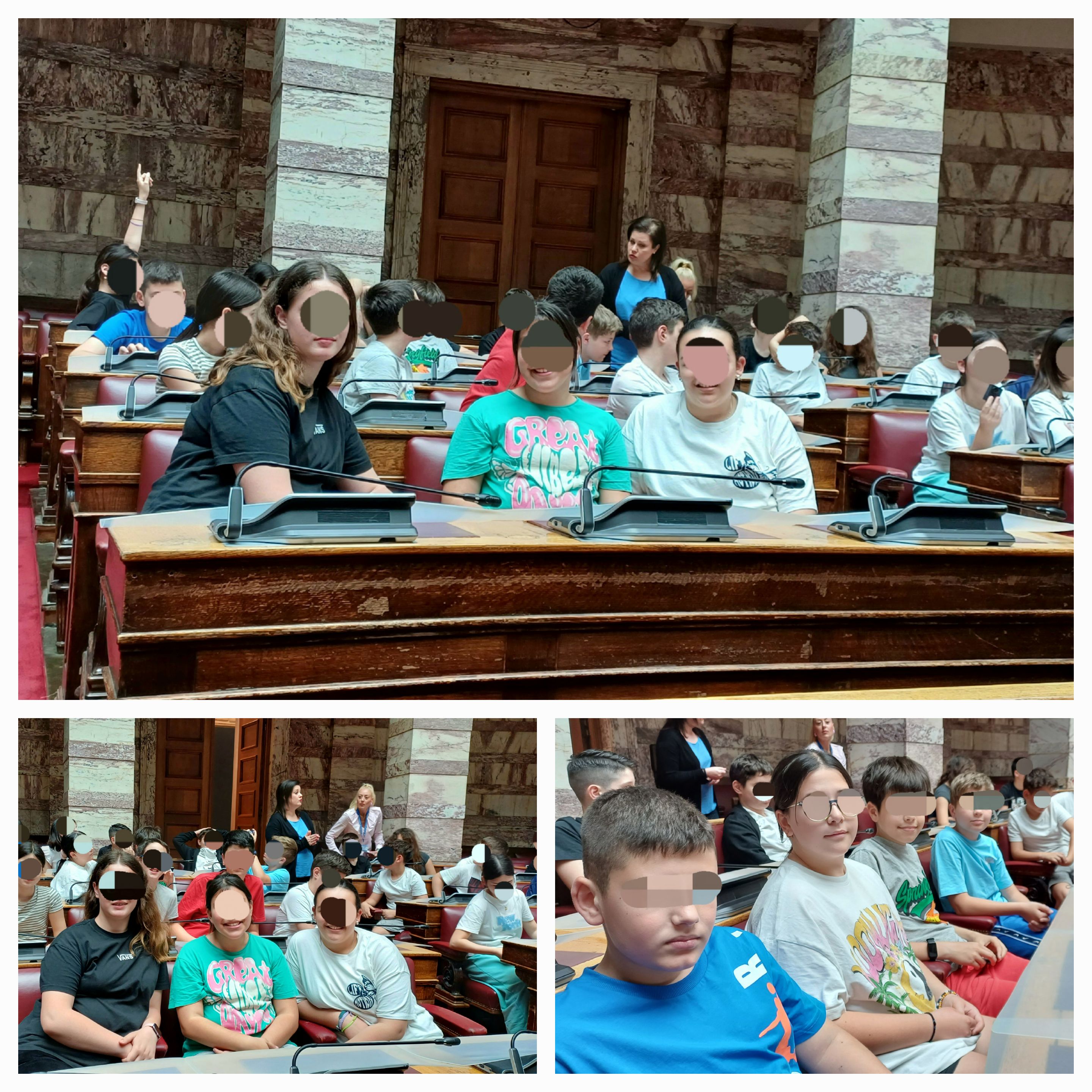 Επίσκεψης στη Βουλή των Ελλήνων και μία ξεναγός και τους οδήγησαν μέσα από το πολυδαίδαλο κτίριο στην Αίθουσα Συνεδριάσεων. Οι μαθητές μας κάθισαν στα βουλευτικά έδρανα της Αίθουσας της Ολομέλειας της Βουλής, νιώθοντας κι οι ίδιοι για λίγο βουλευτές κι ενημερώθηκαν λεπτομερώς από την ξεναγό τόσο για την ιστορία του Ανακτόρου όσο και για τους χώρους και τη λειτουργία του Κοινοβουλίου αλλά και του πολιτεύματος μας γενικότερα.