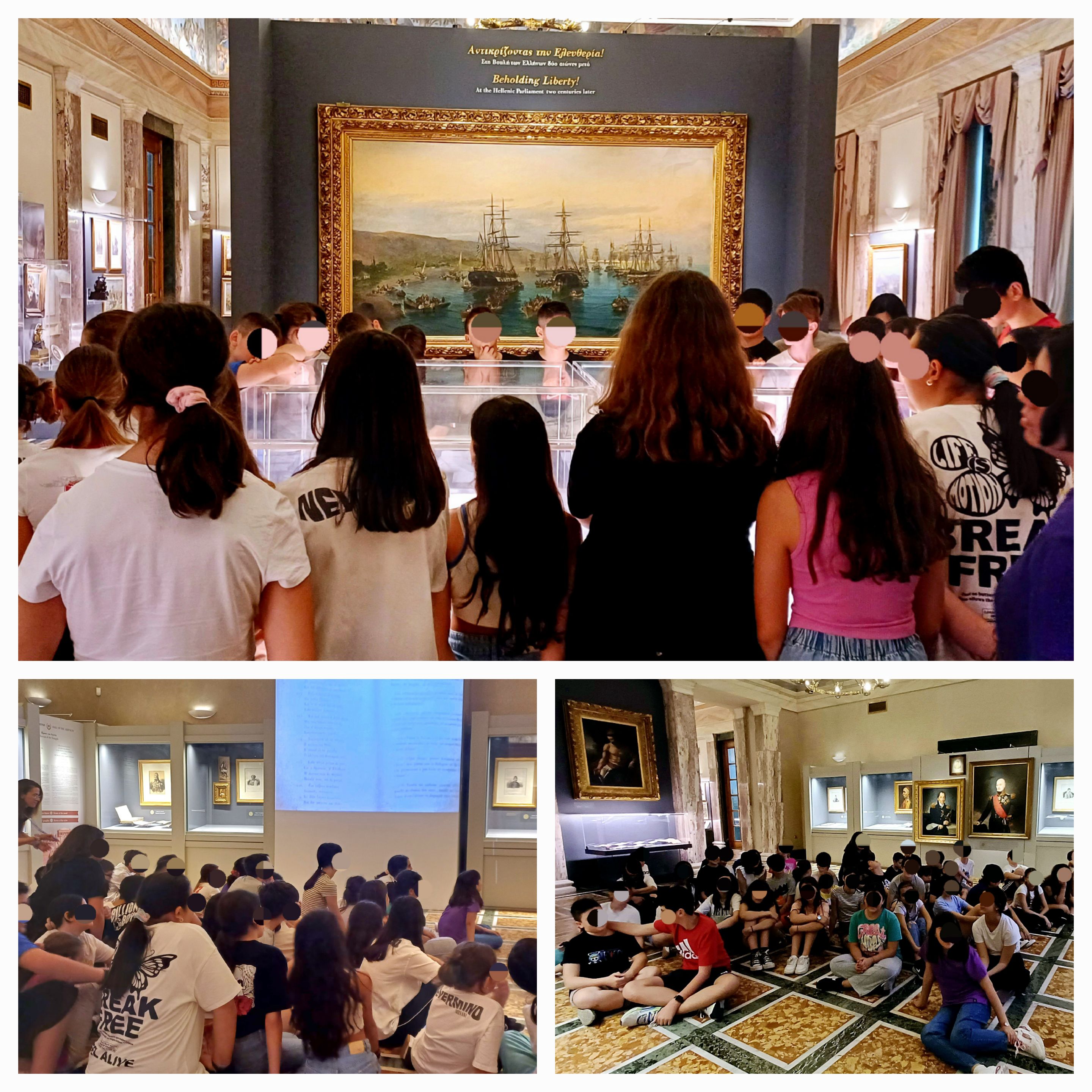 Έπειτα μαθητές και εκπαιδευτικοί είχαν την ευκαιρία να φωτογραφηθούν στη μαρμάρινη διπλή σκάλα του Παλαιού Ανακτόρου και να θαυμάσουν στην αίθουσα «Ελευθέριος Βενιζέλος» την έκθεση ιστορικών αντικειμένων, πινάκων και φωτογραφιών με τίτλο: «Αντικρίζοντας την Ελευθερία. Στη Βουλή των Ελλήνων δυο αιώνες μετά», ενώ παρακολούθησαν κι ένα μικρό βίντεο για το θέμα αυτό. Τέλος επισκέφθηκαν την Αίθουσα της Γερουσίας (μικρογραφία της Αίθουσας της Ολομέλειας της Βουλής), όπου διάφορες επιτροπές συνεδριάζουν πριν ολοκληρώσουν τις εργασίες τους στην Ολομέλεια, και το Εντευκτήριο της Βουλής (το σαλόνι της Βουλής, όπως λέγεται), που λειτουργεί ως χώρος ομιλιών και συναντήσεων με πολιτικά πρόσωπα αλλά και ως χώρος ξεκούρασης μεταξύ των συνεδριάσεων για τους βουλευτές.