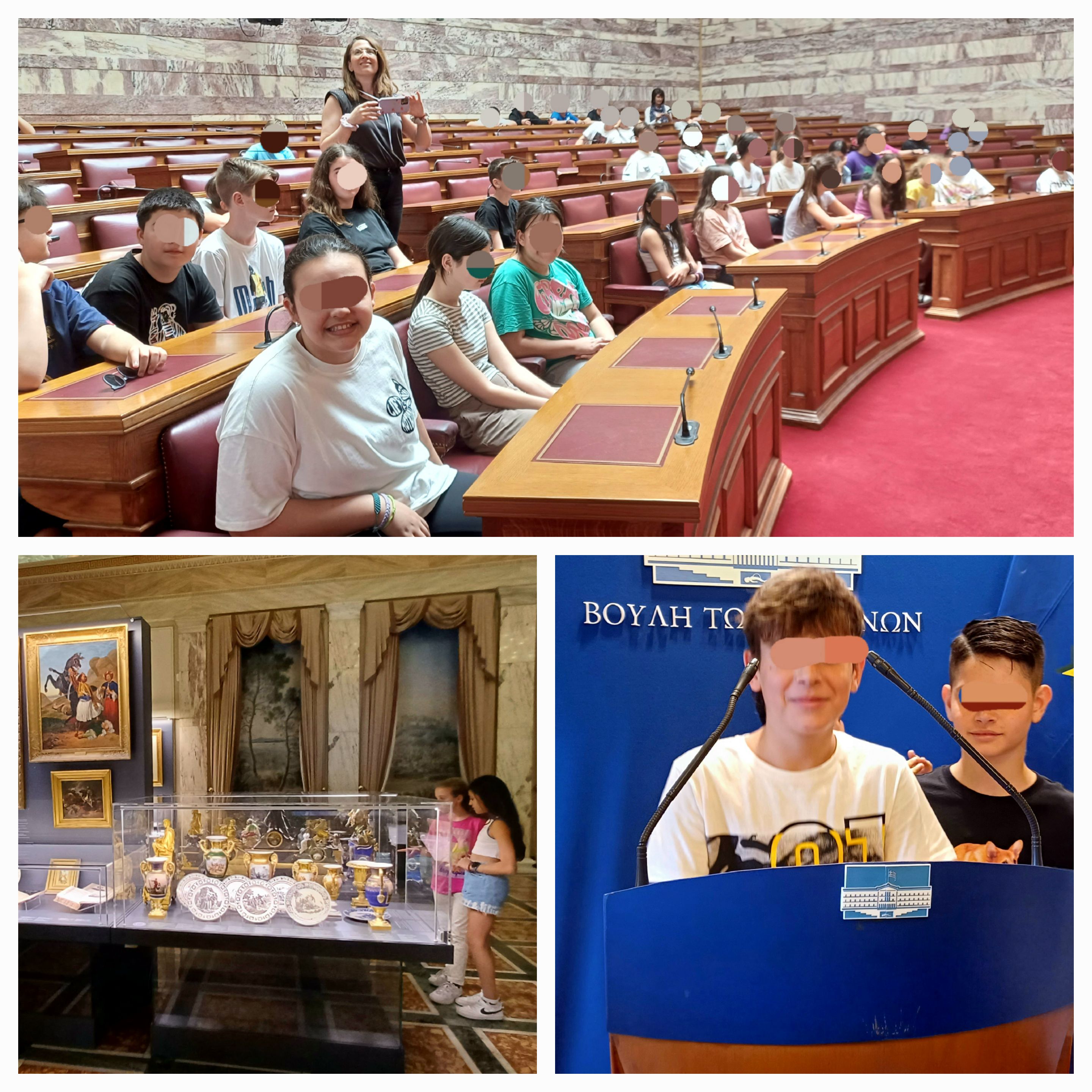 Επίσκεψης στη Βουλή των Ελλήνων και μία ξεναγός και τους οδήγησαν μέσα από το πολυδαίδαλο κτίριο στην Αίθουσα Συνεδριάσεων. Οι μαθητές μας κάθισαν στα βουλευτικά έδρανα της Αίθουσας της Ολομέλειας της Βουλής, νιώθοντας κι οι ίδιοι για λίγο βουλευτές κι ενημερώθηκαν λεπτομερώς από την ξεναγό τόσο για την ιστορία του Ανακτόρου όσο και για τους χώρους και τη λειτουργία του Κοινοβουλίου αλλά και του πολιτεύματος μας γενικότερα.
