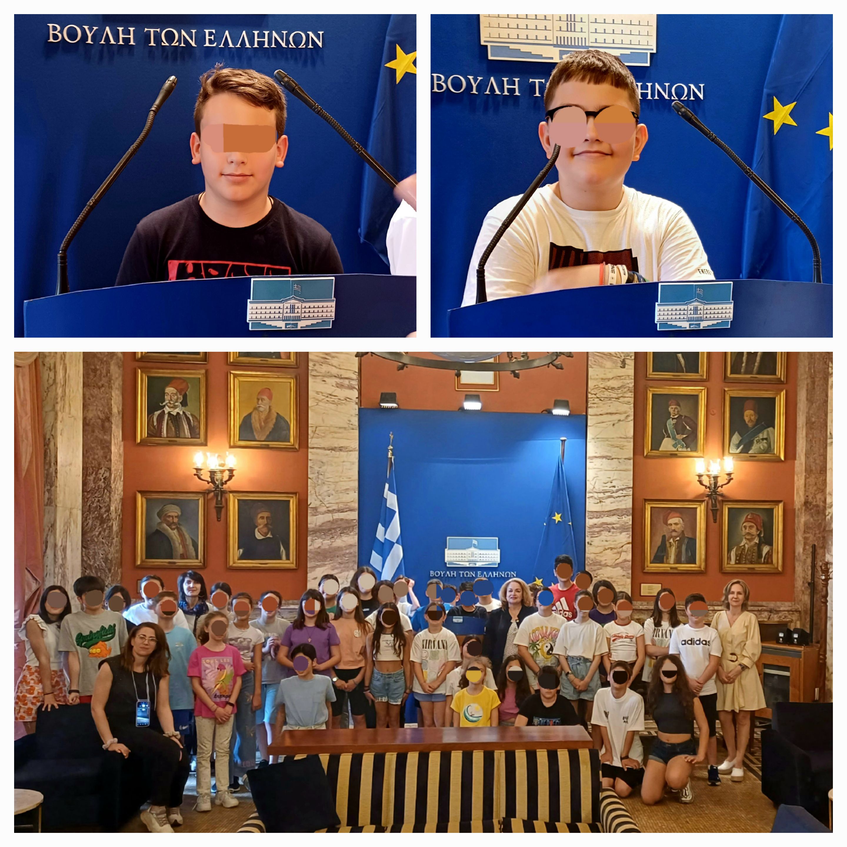 Επίσκεψης στη Βουλή των Ελλήνων και μία ξεναγός και τους οδήγησαν μέσα από το πολυδαίδαλο κτίριο στην Αίθουσα Συνεδριάσεων. Οι μαθητές μας κάθισαν στα βουλευτικά έδρανα της Αίθουσας της Ολομέλειας της Βουλής, νιώθοντας κι οι ίδιοι για λίγο βουλευτές κι ενημερώθηκαν λεπτομερώς από την ξεναγό τόσο για την ιστορία του Ανακτόρου όσο και για τους χώρους και τη λειτουργία του Κοινοβουλίου αλλά και του πολιτεύματος μας γενικότερα.