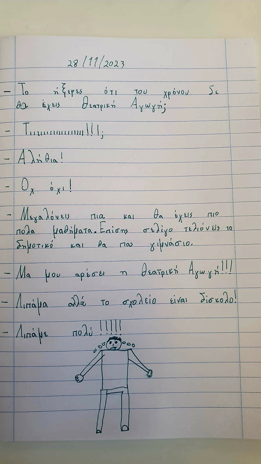 Οι μαθητές της Δ΄τάξης επιπρόσθετα εκφράστηκαν δημιουργικά αποτυπώνοντας τις σκέψεις και τα συναισθήματά τους σε φύλλα εργασίας για την περίπτωση που το μάθημα της Θεατρικής Αγωγής δεν περιλαμβάνεται στο πρόγραμμα των επόμενων τάξεων του σχολείου.Ο έντονος προβληματισμός αλλά και τα αρνητικά συναισθήματα για την περίπτωση αυτή ήταν αυτά που κυριάρχησαν γενικότερα. Άλλη μια απόδειξη ότι τα παιδιά αγαπούν την τέχνη του θεάτρου όπως αυτή εκφράζεται στη σχολική τάξη (δραματοποίηση, αυτοσχεδιασμός, θεατρικό παιχνίδι, σκετς, παράσταση κ.ά) γι΄ αυτό συμμετέχουν με ενθουσιασμό και δίνουν μεγάλη σημασία και αξία στο μάθημα της Θεατρικής Αγωγής.