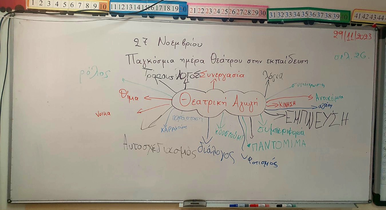 Την Τετάρτη 27 Νοεμβρίου 2023 οι μαθητές της Γ΄και Δ΄τάξης του σχολείου μας με την καθοδήγηση της δασκάλας της Θεατρικής Αγωγής κ. Ελένης Μπουμποπούλου γιόρτασαν με διαδραστικό και καλλιτεχνικό τρόπο την Παγκόσμια ημέρα Θεάτρου στην εκπαίδευση.