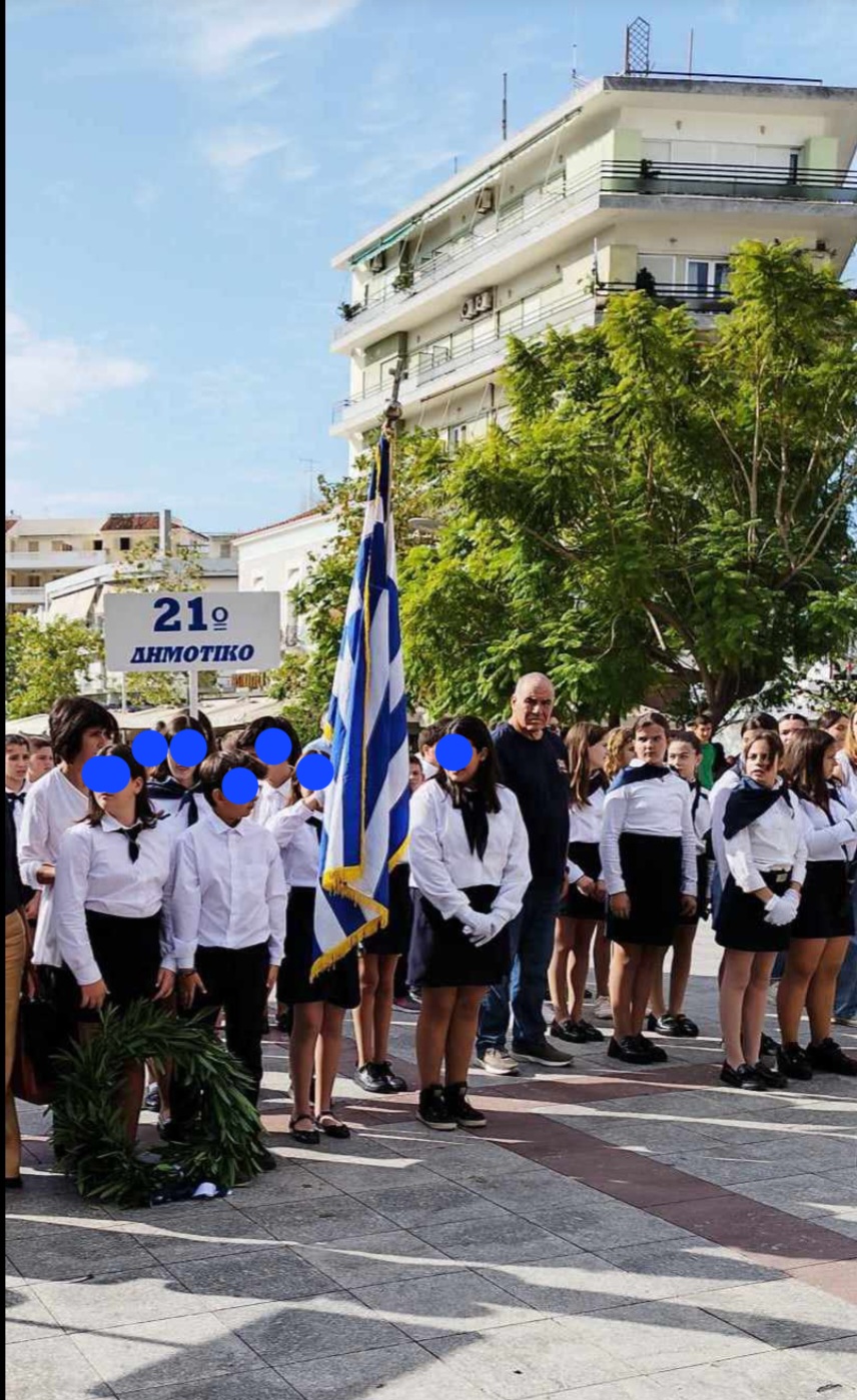 Η Διευθύντρια του Σχολείου κ. Παναγιώτα Βουληγέα συνεχάρη τους μεγάλους πρωταγωνιστές της σχολικής γιορτής, για την αξιέπαινη προσπάθειά τους και τη σημαντική συμβολή τους στην επιτυχία της, καθώς και τις δασκάλες τους Άννα Κορμπίλα, Χριστιάννα Κυριαζοπούλου και Αγγελική Ζαϊτσεβα-Λαζάρου για την πολύτιμη βοήθειά τους τόσο στην οργάνωση όσο και στο άψογο αποτέλεσμα. Εν συνεχεία σε μια μικρή τελετή παρέδωσε τη σημαία του Σχολείου στη σημαιοφόρο μαθήτρια της παρέλασης Αγγελική Μουργή λέγοντάς της να την τιμά και να την κρατά πάντα ψηλά με σεβασμό, αγάπη και περηφάνια.