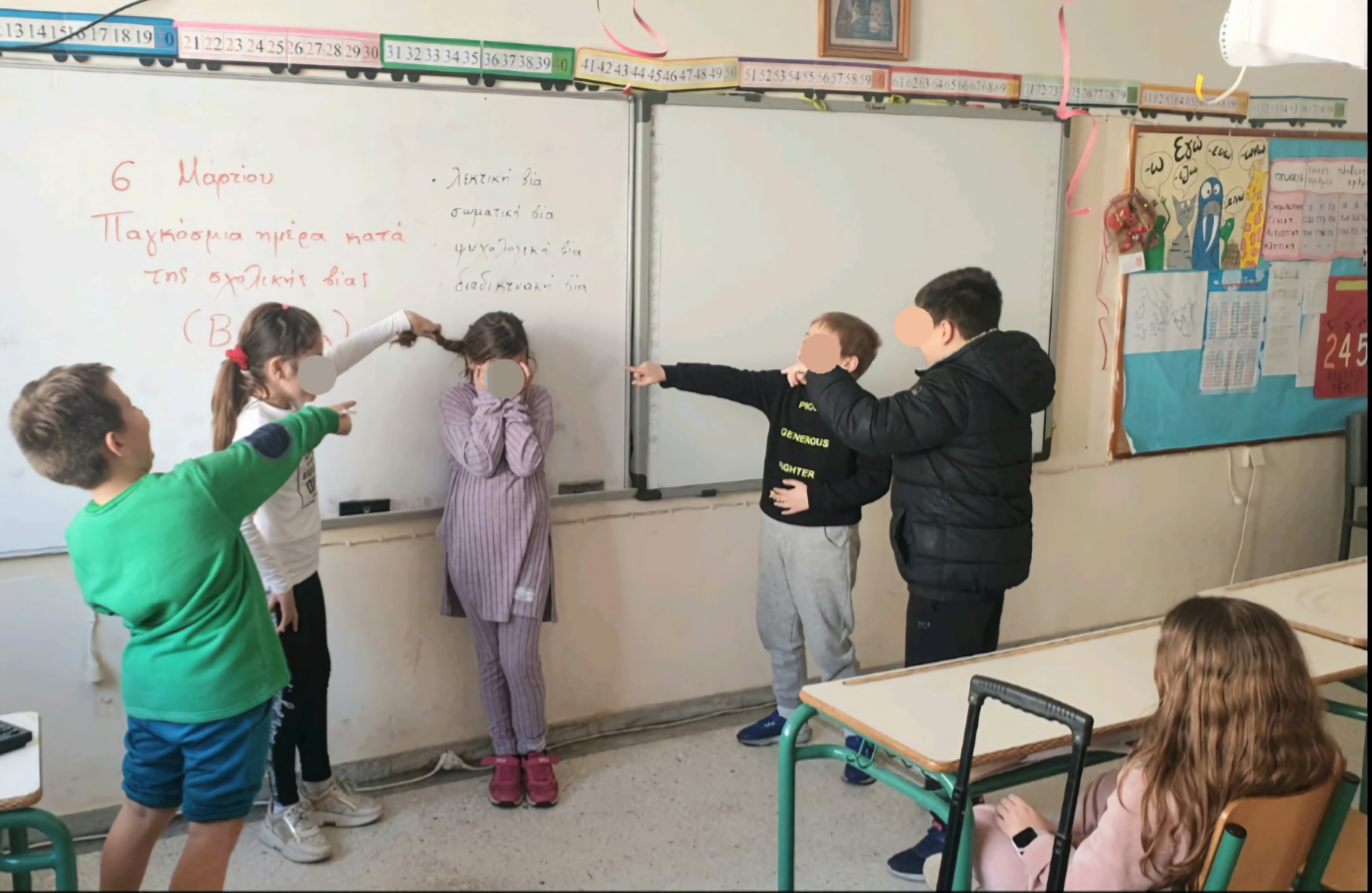 Με αφορμή την Παγκόσμια Ημέρα Σχολικού Εκφοβισμού (6 Μαρτίου) και την ευαισθητοποίηση των μαθητών στο πλαίσιο του μαθήματος της Θεατρικής Αγωγής η εκπαιδευτικός Ελένη Μπουμποπούλου και οι μαθητές των τάξεων Α΄, Β΄, Γ΄ και Δ΄ διάβασαν ιστορίες με θέμα το σχολικό εκφοβισμό. Τα βιβλία τα οποία διαβάστηκαν σε κάθε τάξη ήταν «Ο μυτόγκας» της Ειρήνης Καμαράτου-Γιαλλούση (Α΄τάξη), «Ο νταής του σχολικού» της Μαρίας Ρουσάκη (Β΄τάξη), «Ο Ορφέας και οι νταήδες με τα κίτρινα ποδήλατα» του Μερκούριου Αυτζή (Γ΄τάξη), και «Σιγά τα αυγά» του Κώστα Πούλου (Δ΄τάξη). Μετά την ανάγνωση, η εκπαιδευτικός και οι μαθητές συζήτησαν τις μορφές με τις οποίες εμφανίζεται ο εκφοβισμός: λεκτικός, σωματικός, ψυχολογικός, κοινωνικός, διαδικτυακός, ρατσισμός κ.λ.π. αλλά και για το ρόλο και τα χαρακτηριστικά που έχουν τα εμπλεκόμενα μέρη: θύτης, συνεργοί θύτη, θύμα, παρατηρητής/-ές και ενήλικας βοηθός.